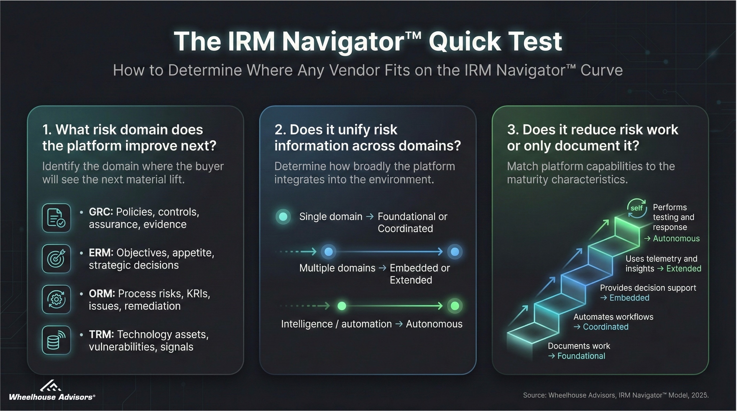 Buyers can classify any risk technology vendor on the IRM Navigator Curve by asking three questions. Each question corresponds directly to the maturity and investment dynamics of the curve.