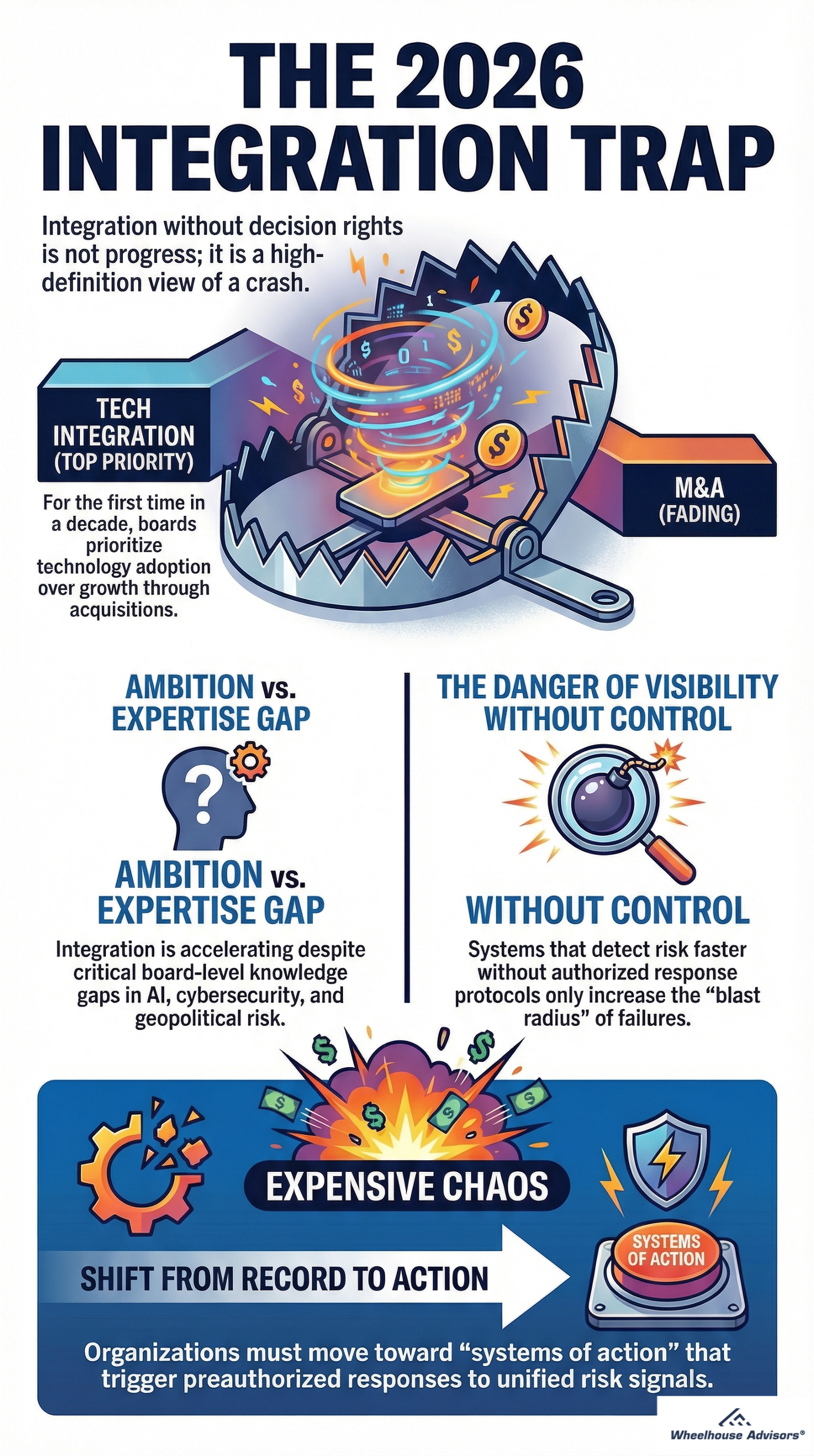 Growth used to win every boardroom vote. Now the data says something different: directors are prioritizing technology adoption and integration as the top 2026 investment, even as they admit their weakest expertise sits in AI, cybersecurity, and geopolitics. We unpack that paradox and show how uninformed speed turns “integration” into a superhighway for risk, unless you pair it with decision rights, embedded controls, and verifiable assurance.